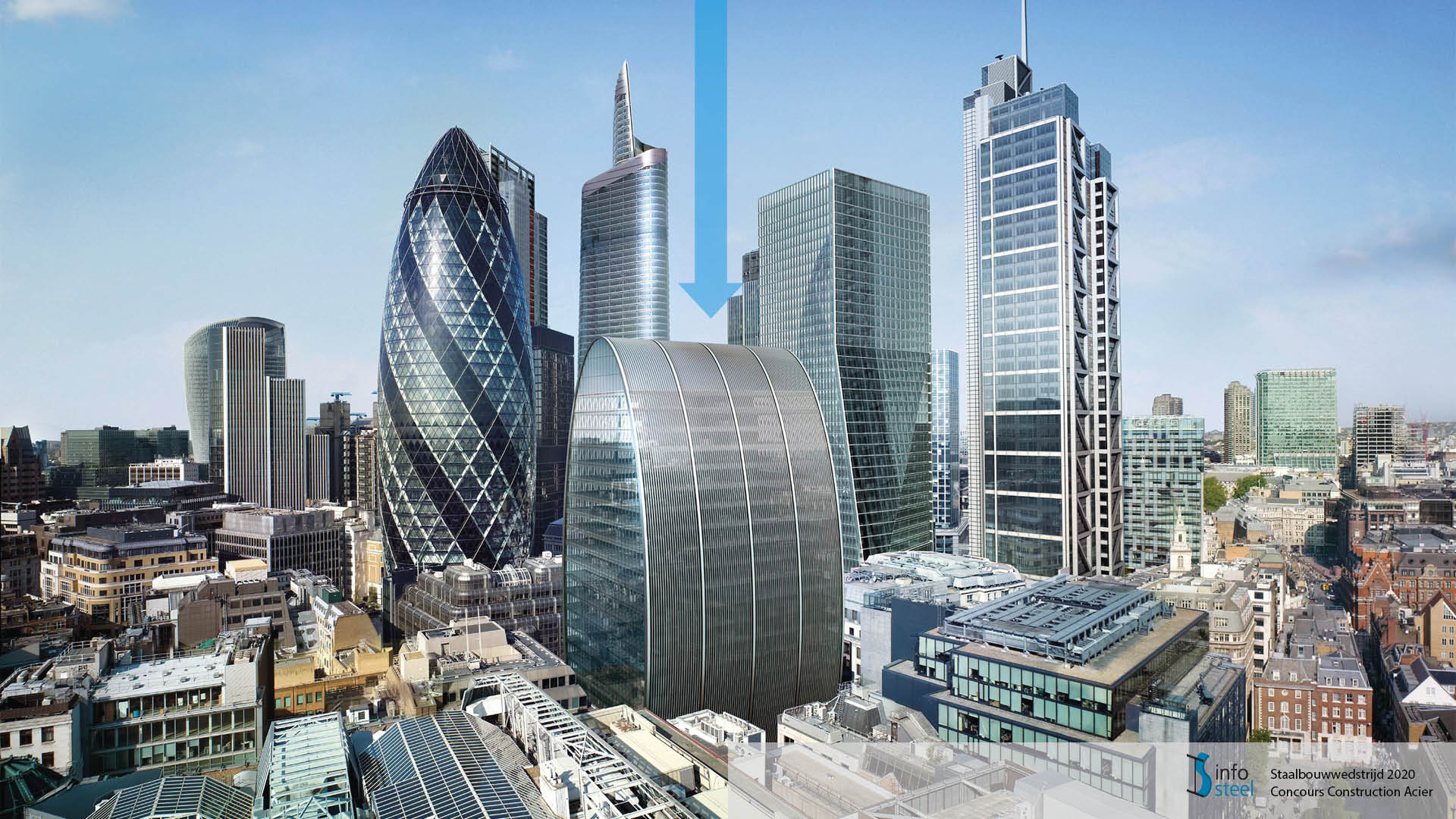 70 St Mary Axe, known informally as the ‘Can of Ham’ because of its curved shape, is an office building in the City of London. Rising to a height of 90 m, it has 24 storeys and a footprint of 48 x 40 m. The load-bearing steel structure of columns and floor beams is built around a concrete core that houses all the pipes, lifts and stairs, and the steel skeleton contains almost 3,000 tonnes of grade S355 steel. The columns are a combination of UC profiles and UCs with welded-on plates; floor beams are either welded-together sheet steel girders or UC profiles. The construction technique selected for the floor – the 33,000 m² floor plates are made of 0.89 mm galvanised steel profiled sheets filled with lightweight concrete – meant that it could be walked on within a week. Each floor comprises an average of 100 structural steel elements that took on average 1.5 weeks to assemble per floor. The roof structure is made up of 5 curved composite profiles.