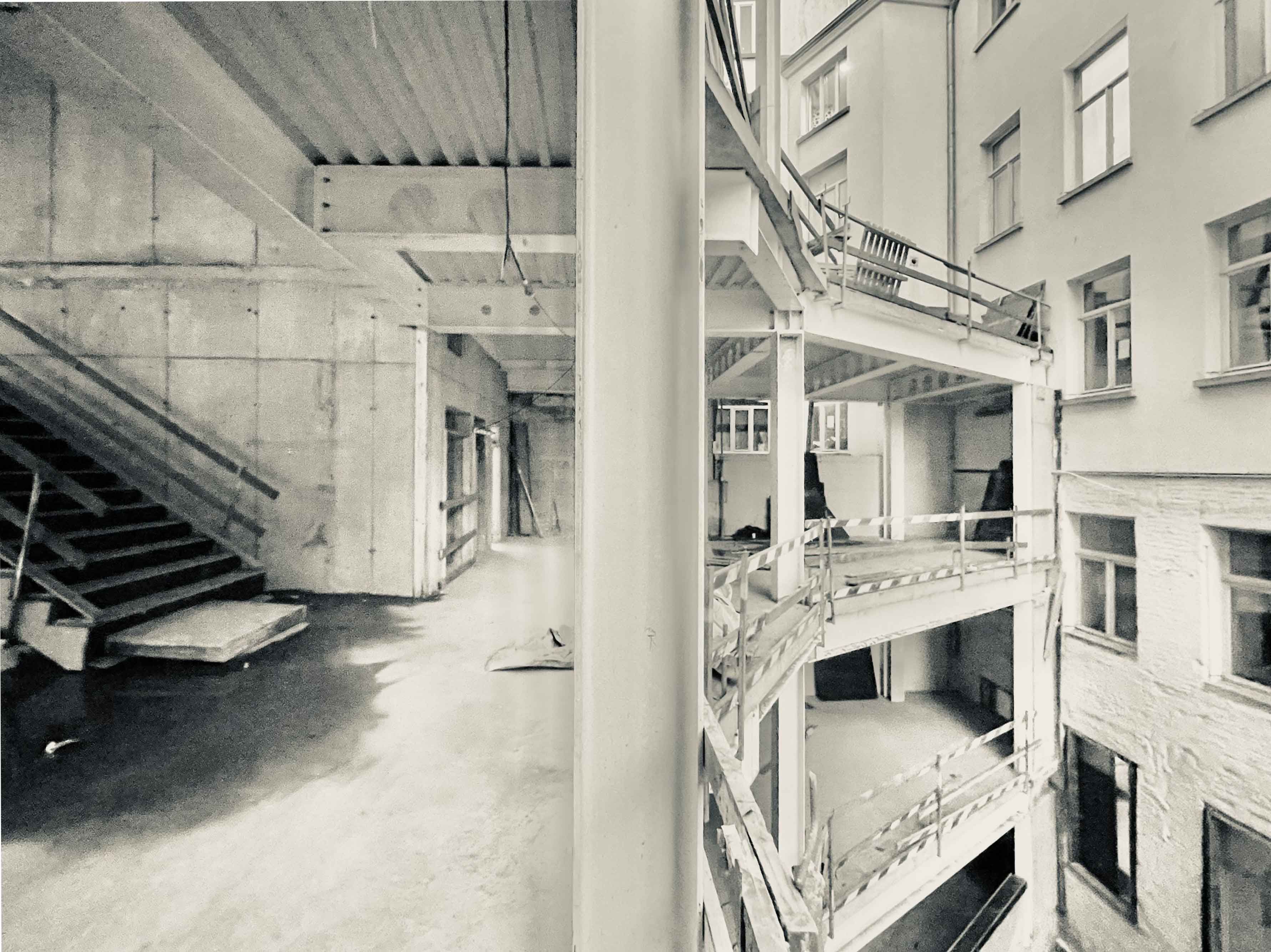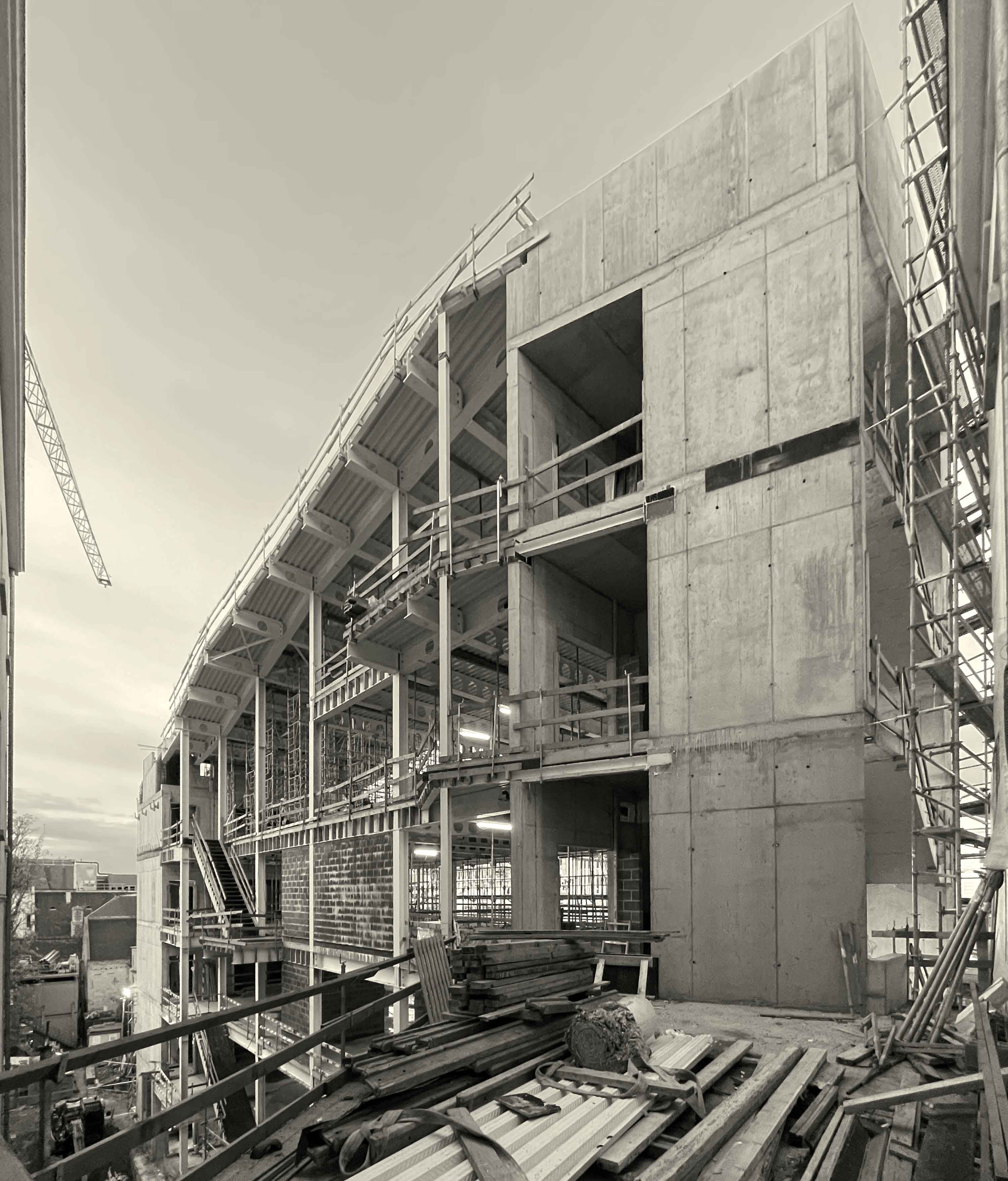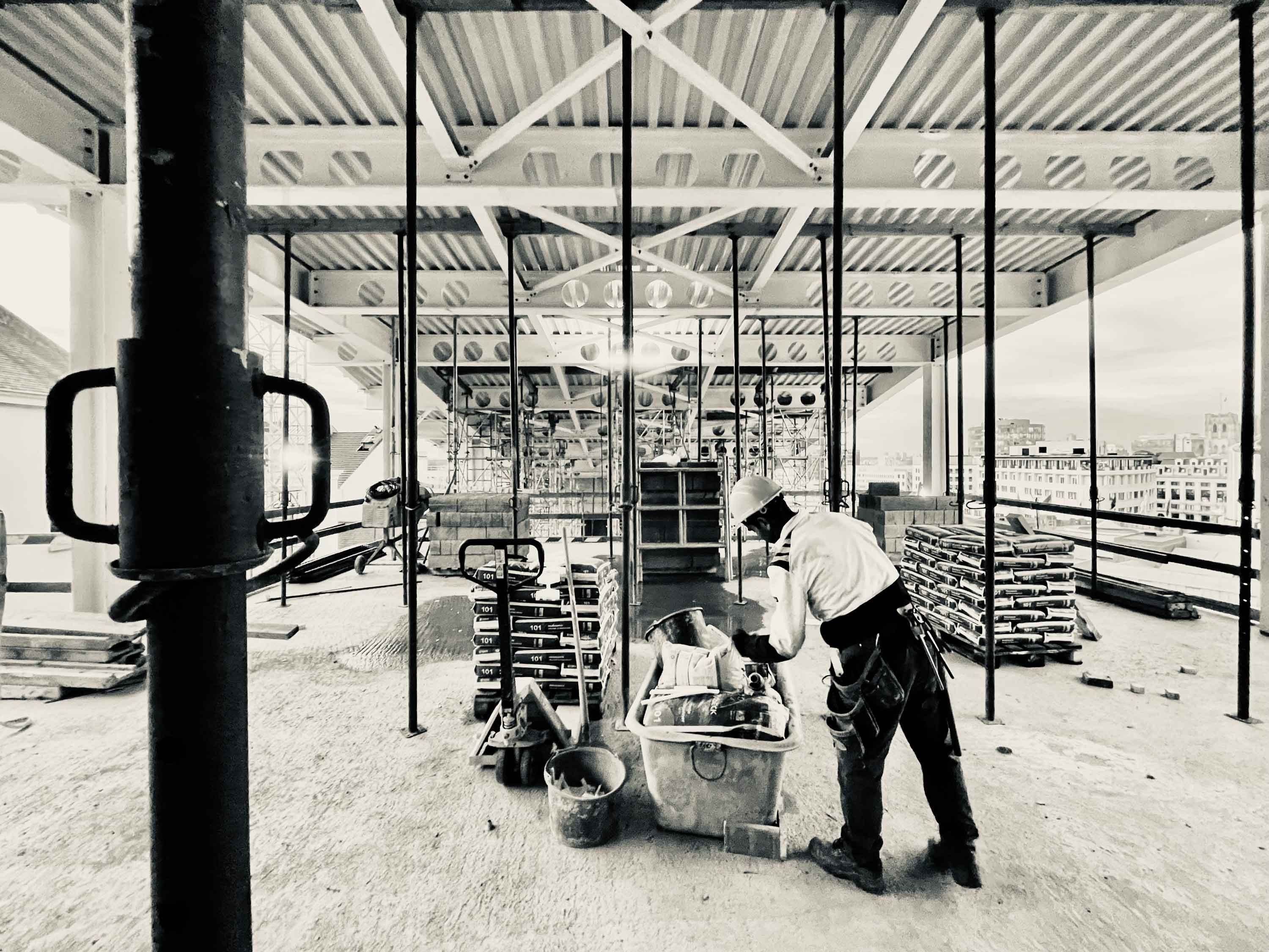 La réalisation de la structure métallique, confiée au constructeur Dugardein – De Sutter, a nécessité une logistique de précision en raison de l'exiguïté du site. Le montage de la charpente s’est effectué par l’intérieur, niveau par niveau, avec des livraisons de composants métalliques programmées en flux tendu. Puisque l'architecte a souhaité laisser la structure largement apparente, une attention particulière a été portée à la finition esthétique des nœuds d'assemblage et de la charpente. En sous-sol, le projet assure une connexion stratégique avec le parcours muséal du Coudenberg et offre de nouveaux espaces de stockage à Bozar, faisant de ce bâtiment un outil de liaison fonctionnel et technique au sommet du Mont des Arts.