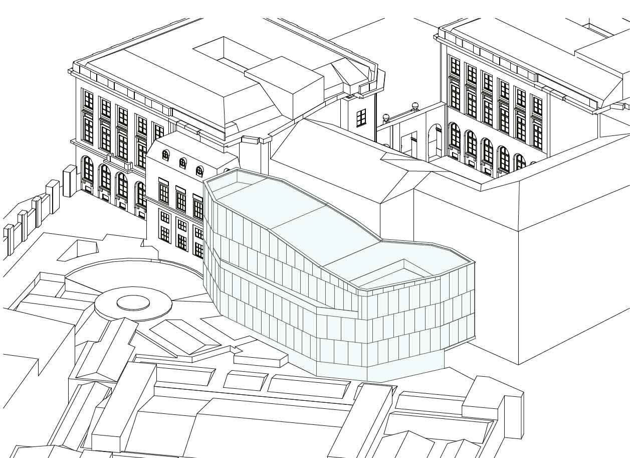 Sur le plan de l'ingénierie, l'équipe d'Arcadis a opté pour une structure mixte acier-béton afin de répondre aux contraintes de charge et de gabarit. La charpente métallique collabore avec des dalles en béton goujonnées, une solution qui permet d’alléger les assemblages et de stabiliser les descentes de charges dans une empreinte au sol maîtrisée, évitant ainsi de fragiliser les fondations anciennes. Un défi structurel majeur réside dans la boîte suspendue en porte-à-faux au-dessus de la cour du Coudenberg, maintenue par quatre points d’accroche principaux via une triangulation rigoureuse. Pour optimiser les hauteurs sous plafond et l'intégration des techniques, des poutrelles alvéolées ont été privilégiées.