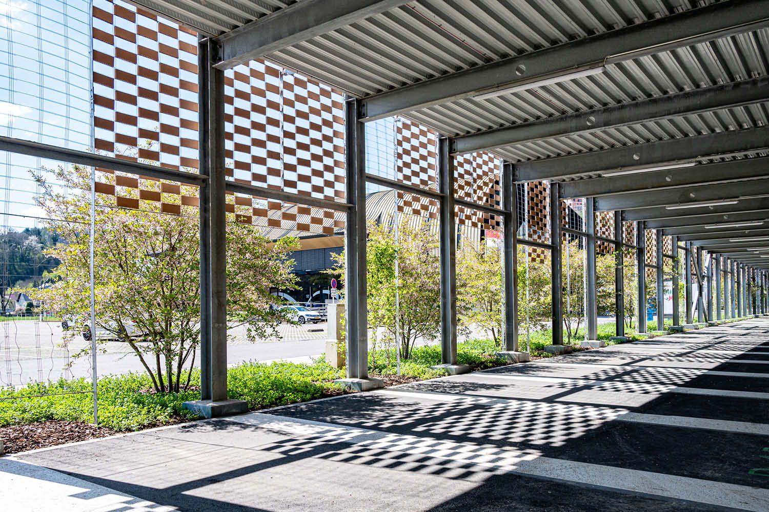 À Ettelbruck, le nouveau parking couvert « Am Däich » a ouvert ses portes au début du mois d’avril 2021. Construit en zone inondable, ce parking public couvert de trois étages offre une capacité globale de 502 places avec ascenseur. L’aspect du bâtiment sort de l’ordinaire, grâce à une enveloppe souple fixée sur l’ossature métallique de la construction. Celle-ci est constituée d’une maille tressée de fils en acier, dans lesquels sont insérées des pièces extrudées en argile cuite.