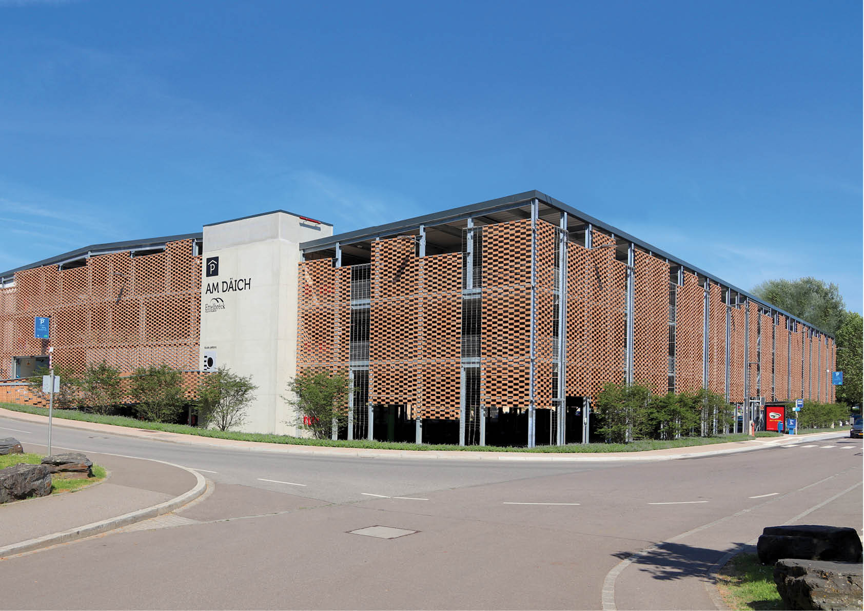 Deze publieke parkeergarage van drie verdiepingen is gebouwd in een overstromingsgebied en heeft een totale capaciteit van 502 plaatsen (inclusief een lift). De belangrijkste structurele elementen maken gebruik van gelaste plaatliggers op maat voor de kolommen en balken, gecombineerd met beton met behulp van deuvels. Om het gewicht van de constructie en de afmetingen van de profielen te beperken, zijn de kolommen en liggers vervaardigd in staalkwaliteit S460. Vooraf werd er in de fabriek een anticorrosiebehandeling toegepast. Doordat de balken zo gedimensioneerd zijn dat ze zelfdragend zijn bij de plaatsing van de vloerplaten, konden de werkzaamheden snel en efficiënt verlopen. Om het gebouw visueel te verfraaien, is een flexibele huid aan het metalen frame van de constructie bevestigd. Dit bestaat uit een gevlochten grid van staaldraden, waarin geëxtrudeerde stukken gebakken klei zijn aangebracht.