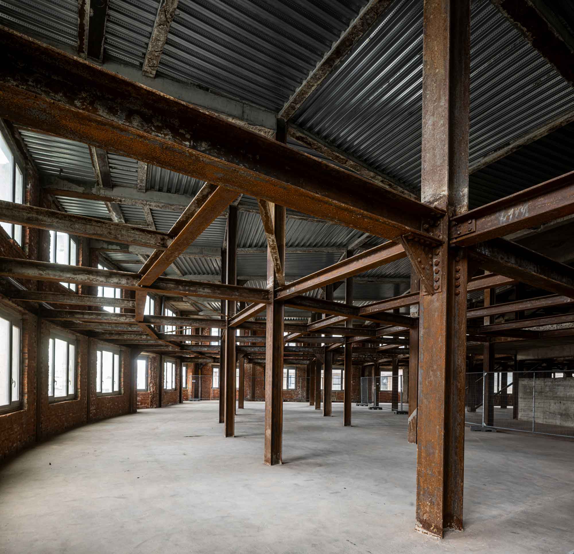 Het gestripte gebouw met zichtbaar staalskelet en vernieuwde tussenvloeren.